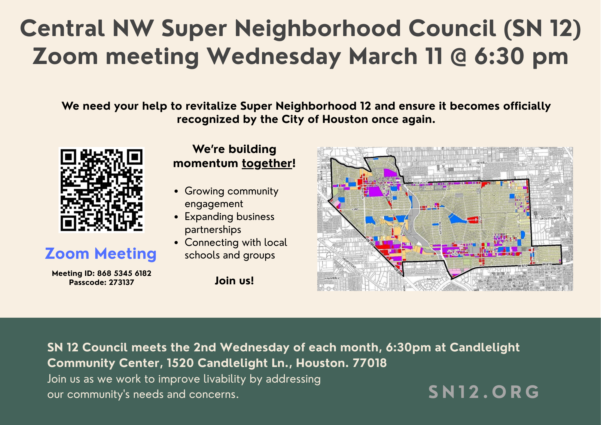 The Central NW Super Neighborhood Council meets the fourth Wednesday of every other month (unless holiday weeks prevail). The public is welcome. We meet at the Candlelight Community Center, at Oak Forest and Candlelight Lane.