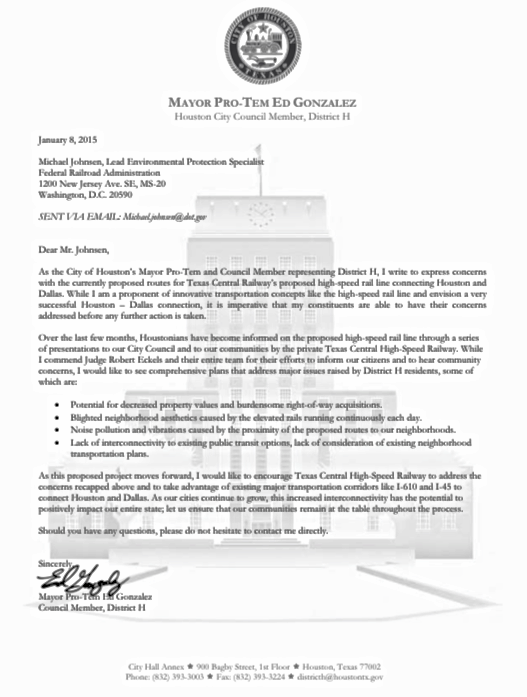 FRA Comment submitted by Ed GonzaleZ, City of Houston Mayor Pro-Tem / Council Member District H