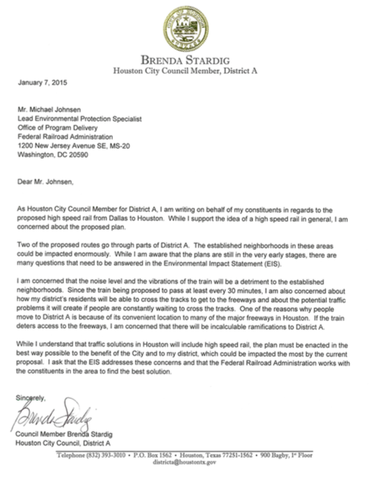 FRA COMMENT SUBMITTED BY Brenda Stardig, CITY OF HOUSTON COUNCIL MEMBER DISTRICT A