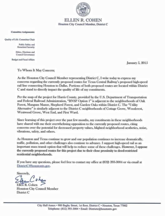 FRA COMMENT SUBMITTED BY Ellen Cohen, CITY OF HOUSTON COUNCIL MEMBER DISTRICT C